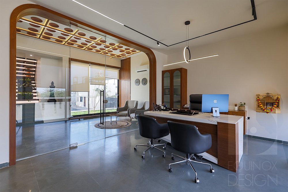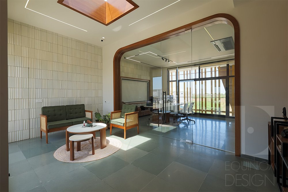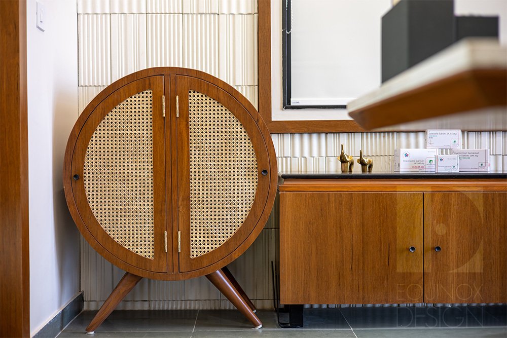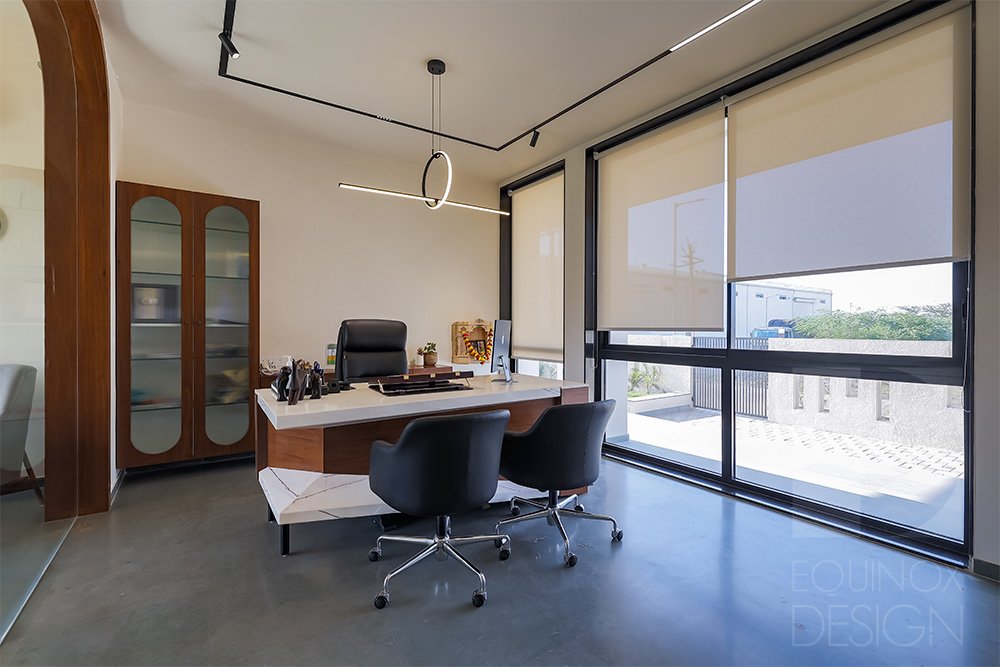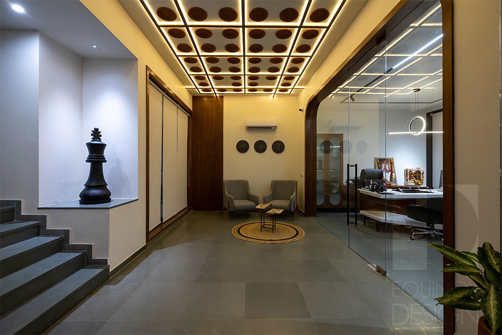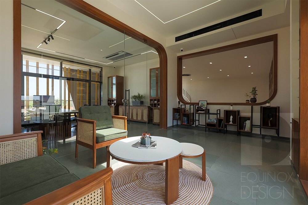 The reception space into a warm and inviting place, with its double heighted wall panelling, offering vastness with elegance, floor to ceiling windows allowing natural light to pour in. Being the office of a pharmaceutical company, the geometries of round and half-tube shape were explored in a massive way in terms of storage cupboards in the staff area, depicting the tablets and capsules. The appropriate lighting grid beneath the filler slab were the strategic designs. Metaphorically showing the tablet grid package. The combo of rattan furniture and warm and earthy kota stone very well reflected the Indian-ness of the space. A Mondrian grid in form of colourful stained glass towards the west side which creates a phenomenon of light and shadow play on the wall. A natural light is grabbed in from the skylight (kind of an oculus), in directors chamber.