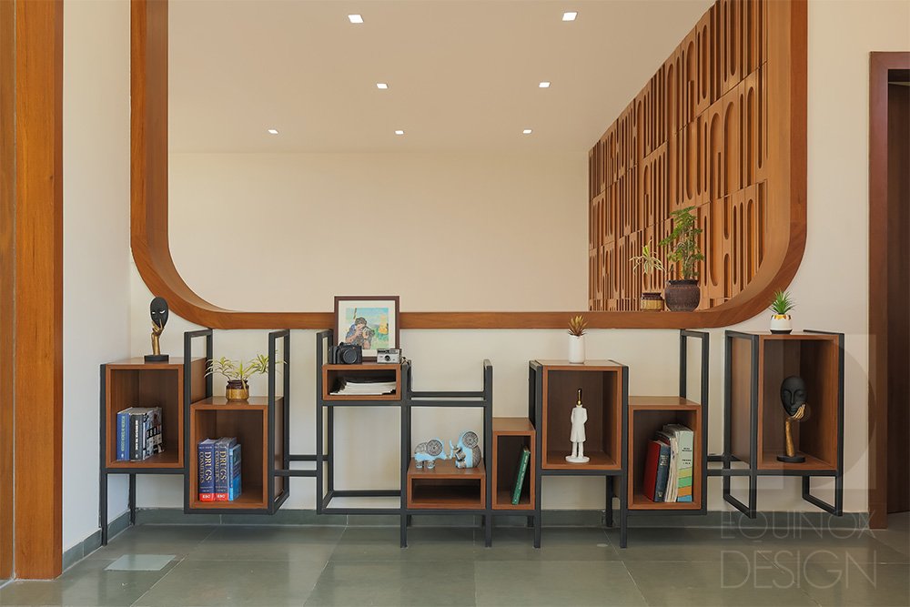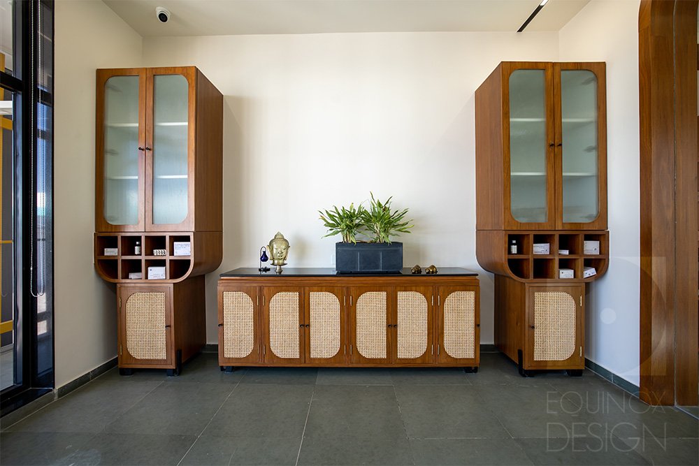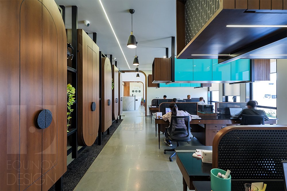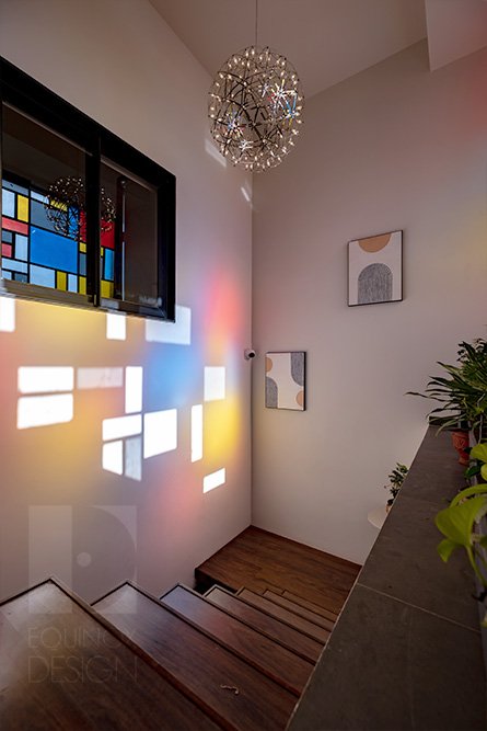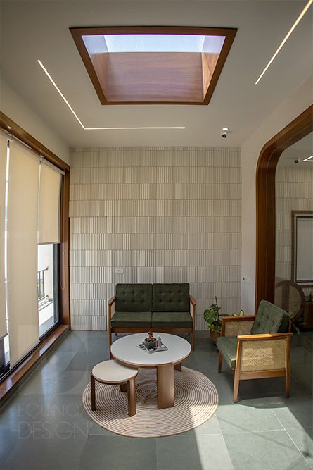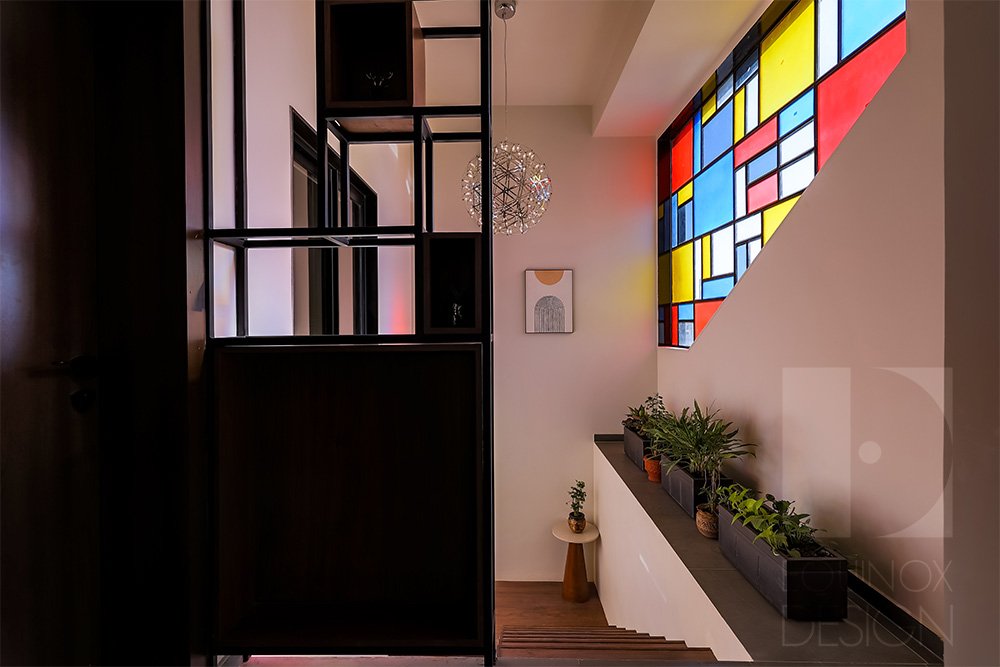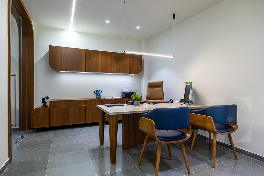 The reception space into a warm and inviting place, with its double heighted wall panelling, offering vastness with elegance, floor to ceiling windows allowing natural light to pour in. Being the office of a pharmaceutical company, the geometries of round and half-tube shape were explored in a massive way in terms of storage cupboards in the staff area, depicting the tablets and capsules. The appropriate lighting grid beneath the filler slab were the strategic designs. Metaphorically showing the tablet grid package. The combo of rattan furniture and warm and earthy kota stone very well reflected the Indian-ness of the space. A Mondrian grid in form of colourful stained glass towards the west side which creates a phenomenon of light and shadow play on the wall. A natural light is grabbed in from the skylight (kind of an oculus), in directors chamber.